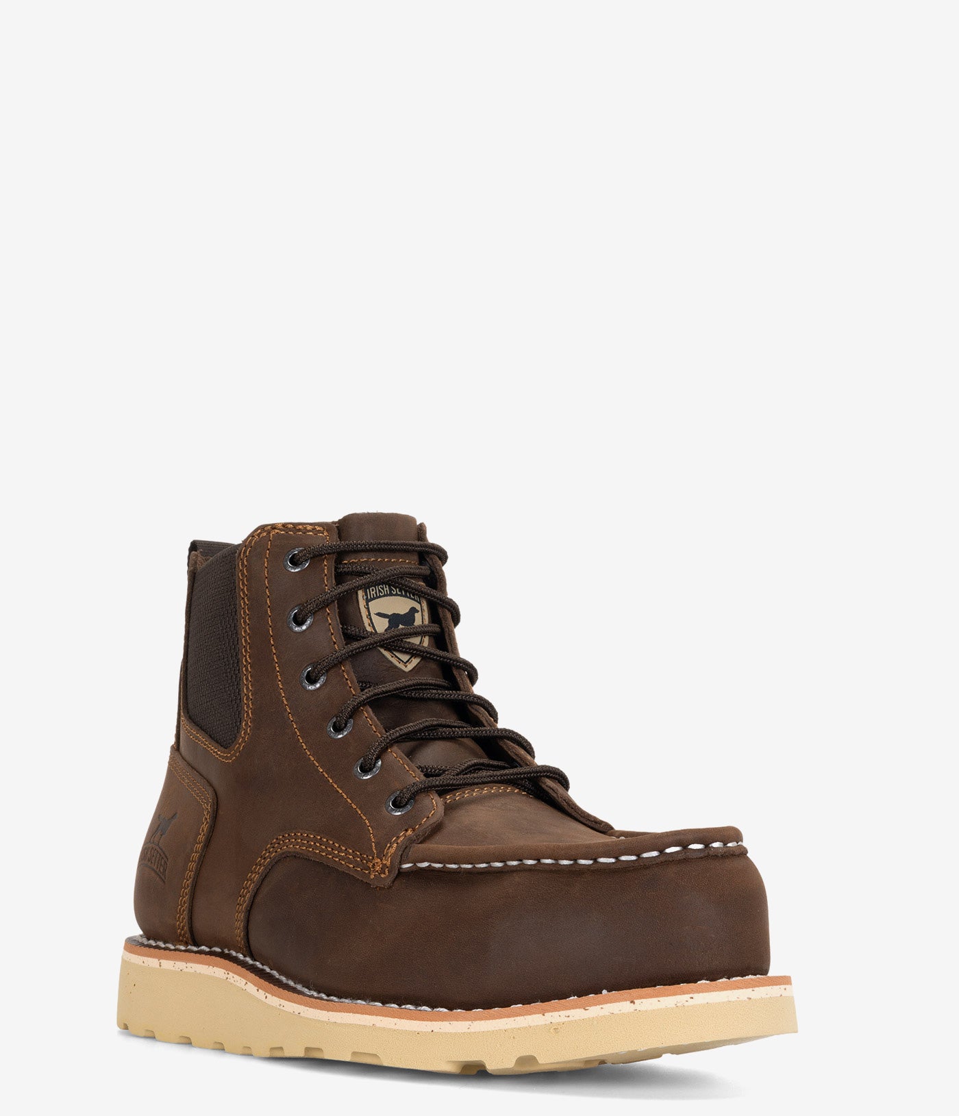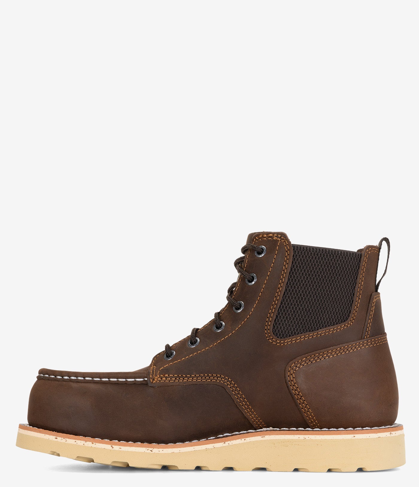 These moc‑toe wedge work boots start with premium full‑grain leather, shaped into a timeless moc profile that’s as practical as it is tough. The pull‑on design uses faux lacing and dual elastic panels to create the look of a lace‑up while delivering easy on‑off convenience—no bending or tying required. This steel safety toe work boot provides crucial impact and compression protection and is reinforced with triple stitching in high-wear zones for long-lasting comfort, durability, and value. And with old‑school, resolable Goodyear Welt construction backed by a slip‑resistant, EH‑rated polyurethane wedge sole that digs in when the floor gets slick or the weather turns, this boot keeps you moving with confidence through long weeks and long seasons.