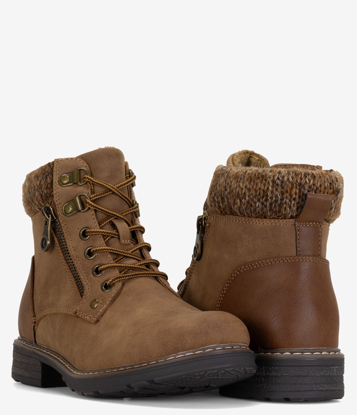 Crafted with vegan leather in a hiker-inspired ankle boot, it features a cozy sweater knit collar, easy D-ring lacing, and a medial zipper that makes slipping them on a breeze. With its stylish lateral zipper and stud accents, these cute ankle boots stand out and make a statement. Inside, soft faux fur and a cushioned footbed provide all the warmth and comfort your feet deserve. Plus, the low heel and flexible sole provide the comfort your feet deserve.