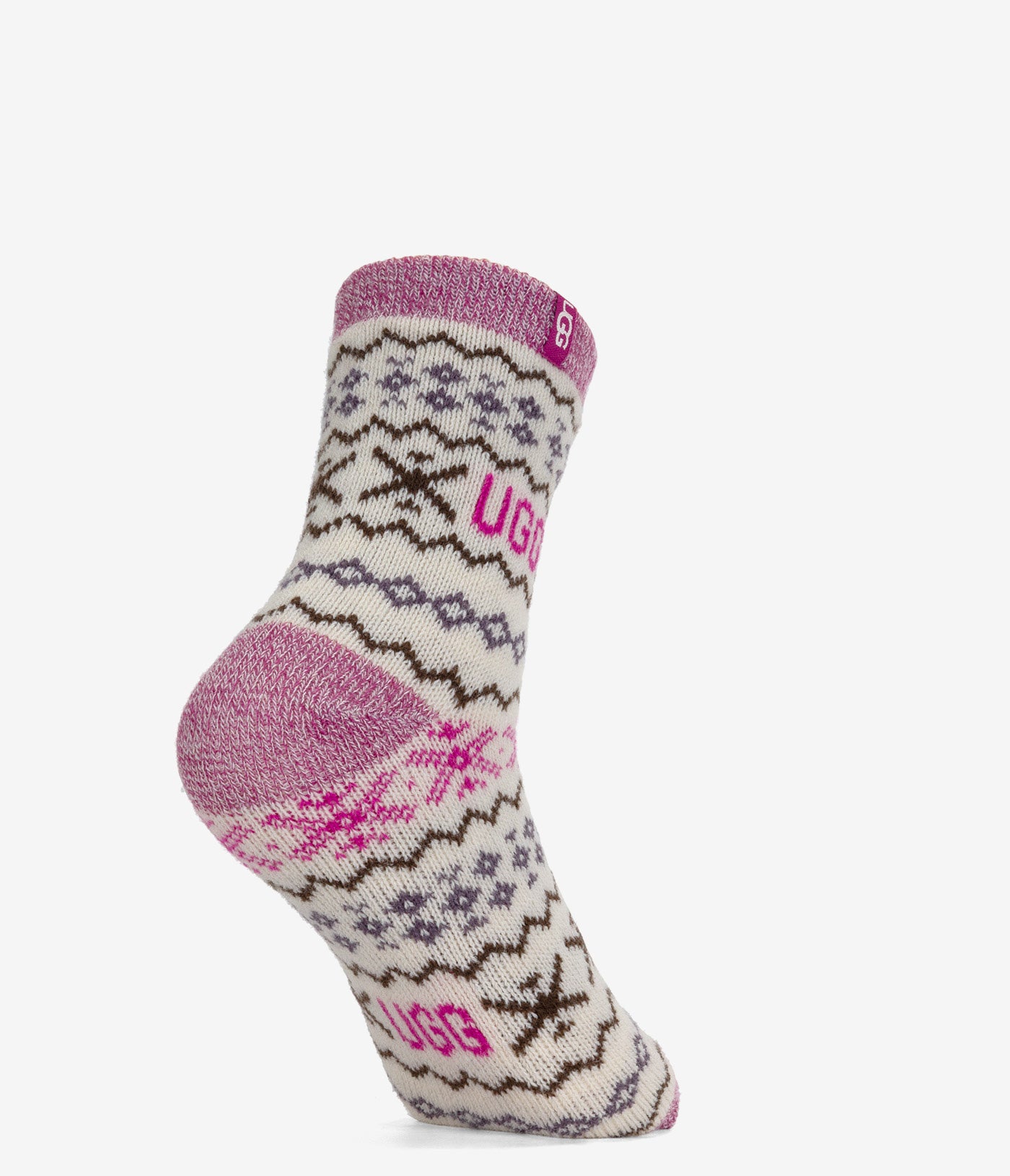 The UGG Cressida Cozy Quarter Socks offer a plush and stylish way to pamper your feet. Designed with a soft blend of acrylic, recycled polyester, and elastane, these socks feature a cozy quarter-length that sits just above the ankle. The standout UGGIsle Fair Isle print adds a seasonal charm, while the marled heel, toe, and cuff provide subtle texture. Finished with a soft twill tape and the iconic UGG® logo on the cuff, they’re perfect for lounging or layering with your favorite UGG boots and slippers.